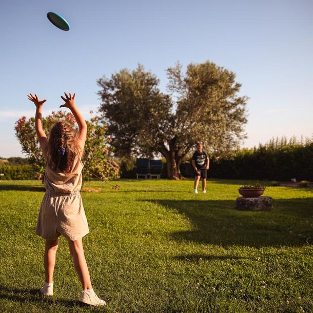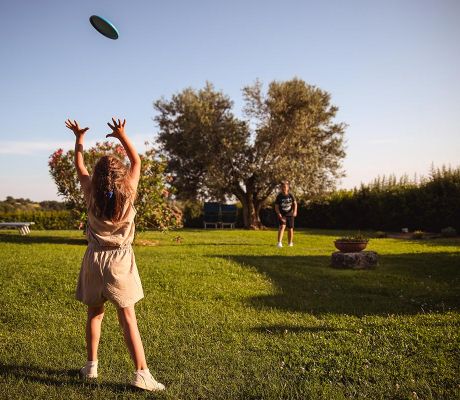 La struttura dell'agriturismo è circondata da prato verde, vigneti e oliveti, dove i bambini trovano la libertà di giocare sereni e spensierati