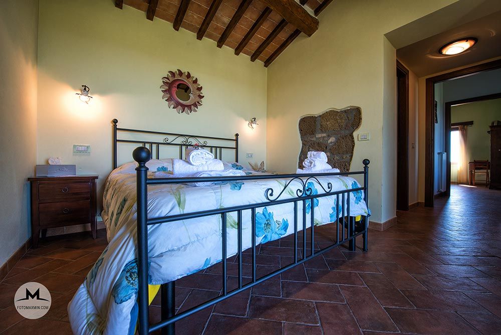 Accogliente camera matrimoniale, perfetta per chi cerca un’atmosfera intima e rilassante. Pur non essendo molto ampia, offre una splendida terrazza con loggiato che si affaccia sul giardino e sulla suggestiva sorgente di Patarrino. La camera è arredata con un elegante letto in ferro battuto e dispone di un bagno privato con doccia.
